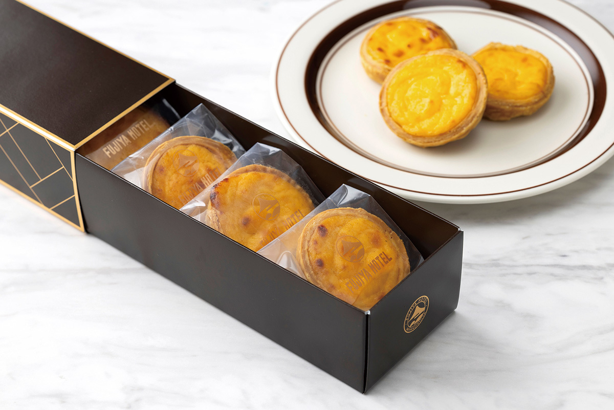 富士屋ホテル内の「ベーカリー&スイーツ ピコット」にて、箱根エッグタルト(6個入り)BOXを販売中。なめらかな口当たりのカスタードクリームがサクサクのパイ生地に包み込まれた一品で、お土産にもおすすめ。