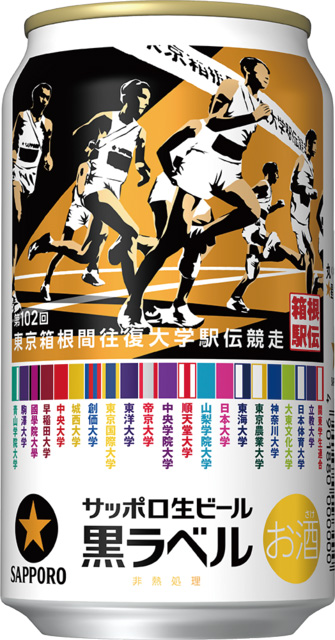サッポロ生ビール黒ラベル「箱根駅伝缶」が数量限定発売。パッケージには出場20校と関東学生連合1チームのたすきをデザイン。350mlの缶はスタート、500mlの缶はゴールの瞬間が描かれ、箱根駅伝のストーリーを感じられる。