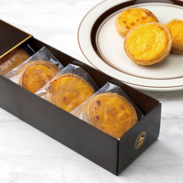 富士屋ホテル内の「ベーカリー&スイーツ ピコット」にて、箱根エッグタルト(6個入り)BOXを販売中。なめらかな口当たりのカスタードクリームがサクサクのパイ生地に包み込まれた一品で、お土産にもおすすめ。